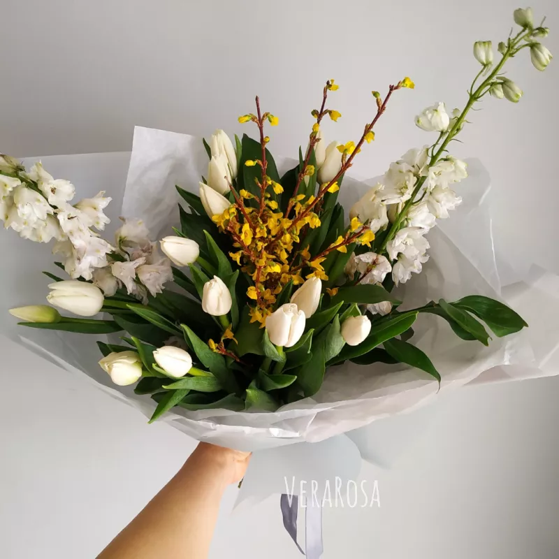 Букет был собран и скорректирован согласно моим пожеланиям, заранее обговаривали все нюансы, в процессе сборки мне прислали фото и видео. Сам букет отлично держался целый день, а потом еще и дома стоял неделю😍